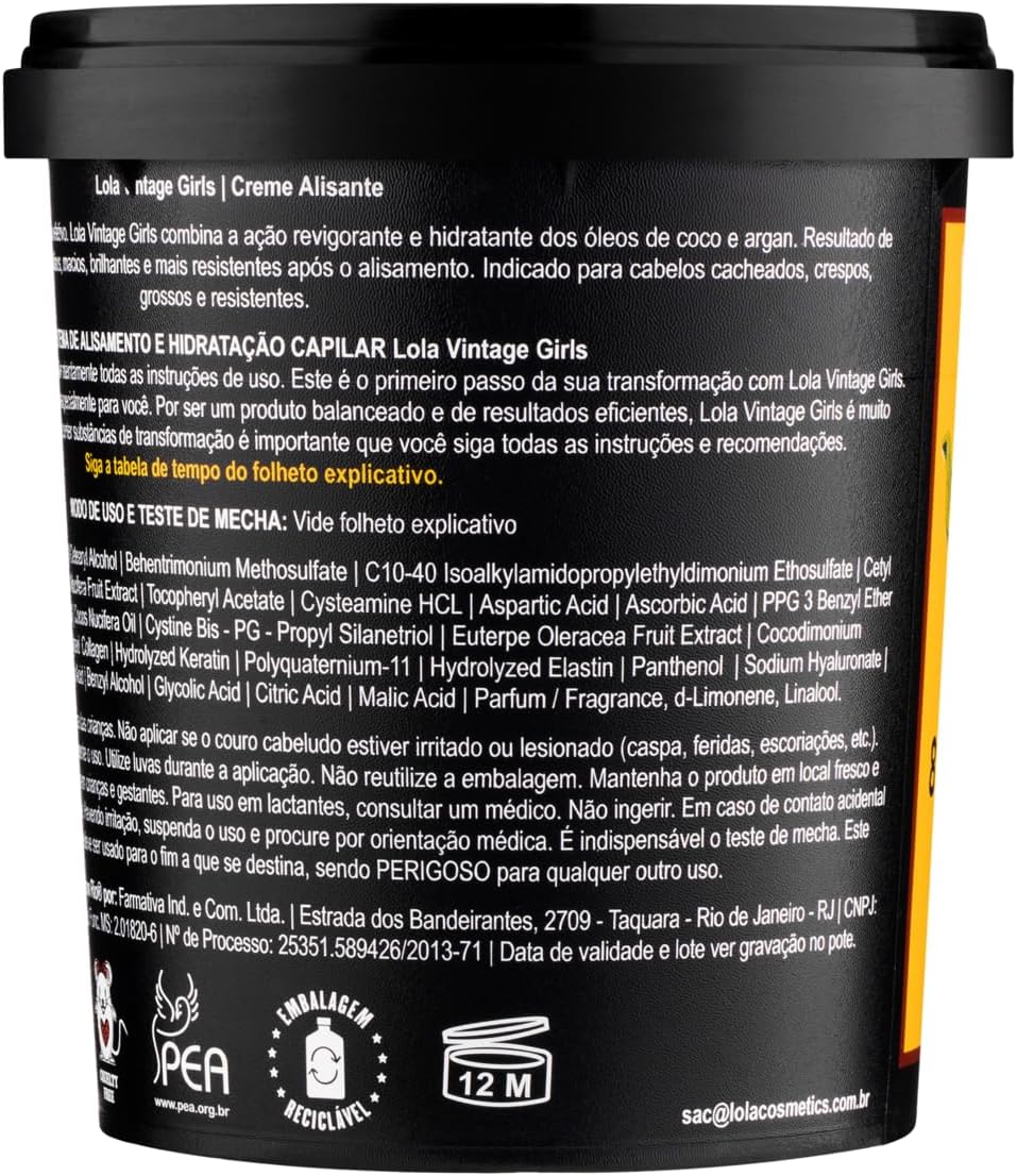 O Creme Alisante Vintage Girls, da linha Lola From Rio, foi desenvolvido para quem busca um acabamento mais alinhado, com redução de volume e sensação de maciez. Sua fórmula cremosa contém agentes hidratantes que ajudam no cuidado dos fios durante o processo de aplicação, contribuindo para um resultado mais suave e brilhante.