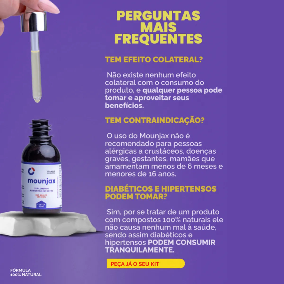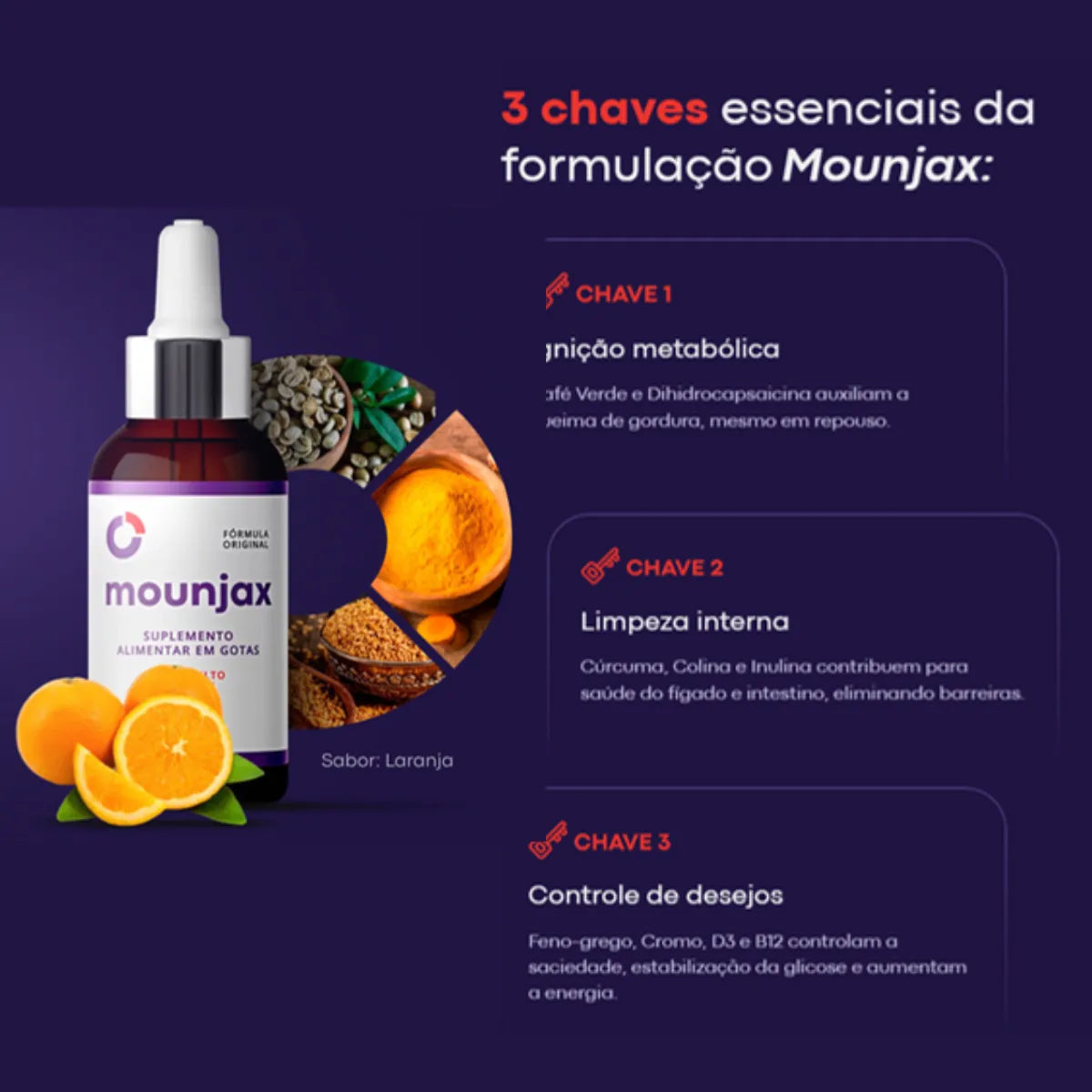 O Mounjax é um suplemento alimentar líquido em gotas desenvolvido para complementar a rotina de quem busca equilíbrio alimentar e organização de hábitos no dia a dia. Seu formato líquido facilita o uso e permite inclusão simples na rotina diária.