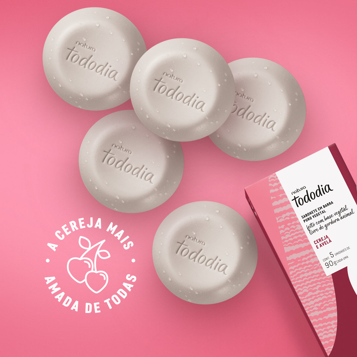 O Sabonete em Barra Tododia Cereja e Avelã limpa suavemente e ajuda a manter a hidratação natural da pele, trazendo uma espuma cremosa e fragrância adocicada frutal que marca presença de forma acolhedora. Ideal para transformar o banho em um momento gostoso de cuidado diário, com toque suave e perfume envolvente.