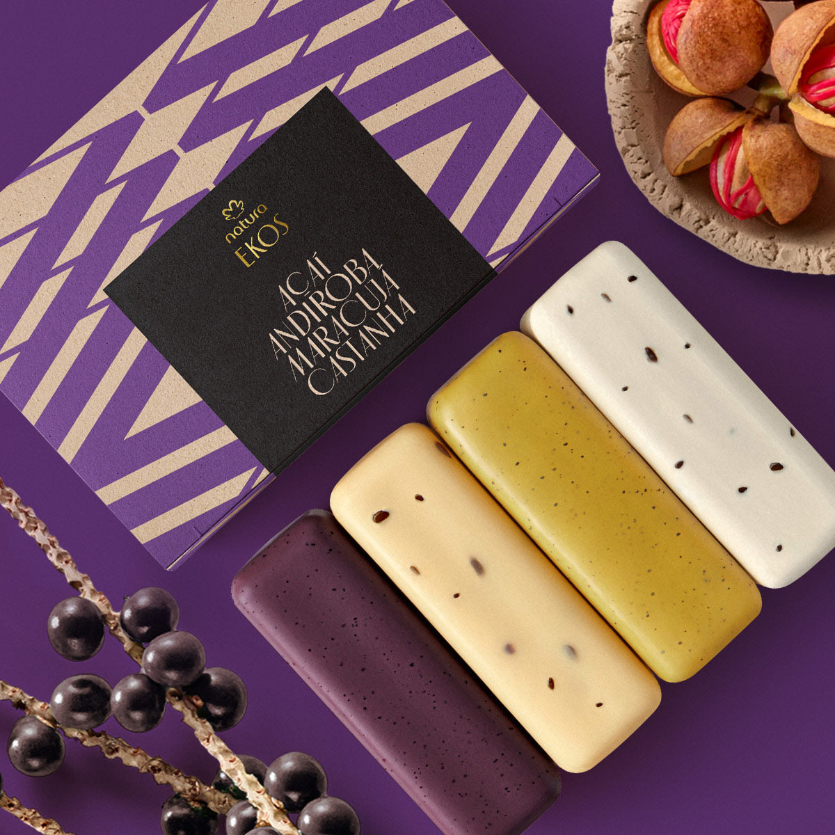 Conteúdo: Caixa com 4 sabonetes de 100g cada (1 Castanha, 1 Maracujá, 1 Açaí e 1 Andiroba)